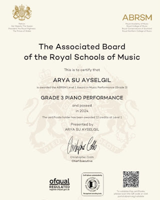Öğrencim Arya Su Ayselgil’in aldığı Royal Akademi ABRSM Sertifikası